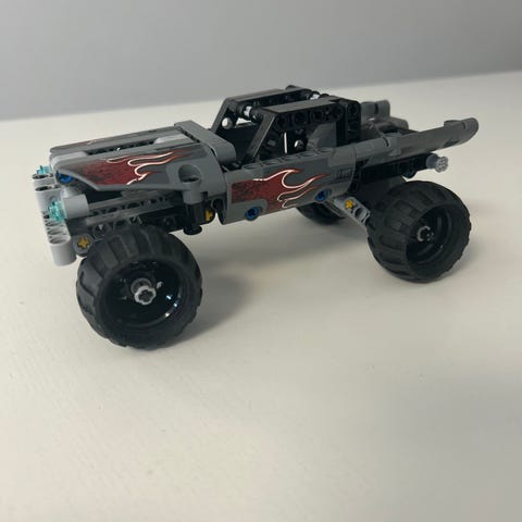 LEGO Technic 42150 maastoauto, jossa valkoinen ja musta väriyhdistelmä ja punaiset renkaat. Rakennussarja sisältää teknisiä yksityiskohtia ja soveltuu yli 7-vuotiaille käyttäjille.