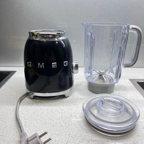 Smeg-tehosekoittimenrunko. Väri kerma. Teho 800 W, käyttöjännite 220-240 V, 50/60 Hz. Lasiastia on rikki, myydään pelkkä runko.