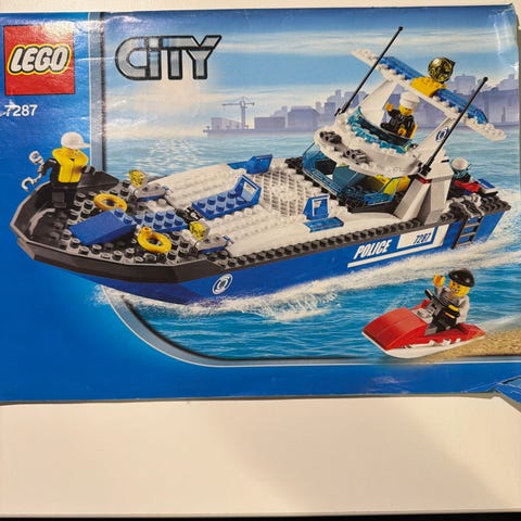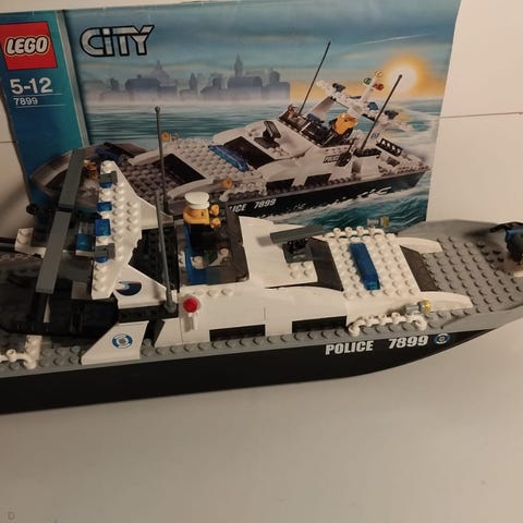Varmaankin lähemmäs 40 vuotta vanha Lego poliisivene (4010), uskoakseni kaikilla varusteilla. Mukana ohjekirja sekä alkuperäisestä laatikosta leikatut etu- ja takakansi.