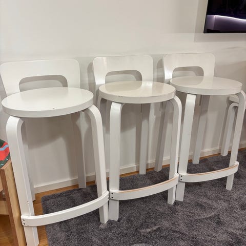 Kaksi Artekin Alvar Aallon suunnittelemaa k65 työtuolia harmaalla linoleumilla. Ajan patinaa, mutta ovat hyvässä käyttökunnossa. Tukevat ja siisti linoleumpinta. Hinta yhdelle tuolille.