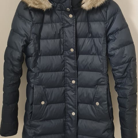 XS-kokoa oleva Hilfigerin valkoinen toppatakki. Irroitettava huppu. Erittäin siisti, vain hihansuissa vähän jälkeä.