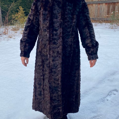 turkistakki ruskea monivärinen. Takki on valmistettu aidosta turkiksesta, jossa on erilaisia ruskean ja valkoisen sävyjä. Takissa on koristeellinen nappi ja se soveltuu kylmempien säiden käyttöön.