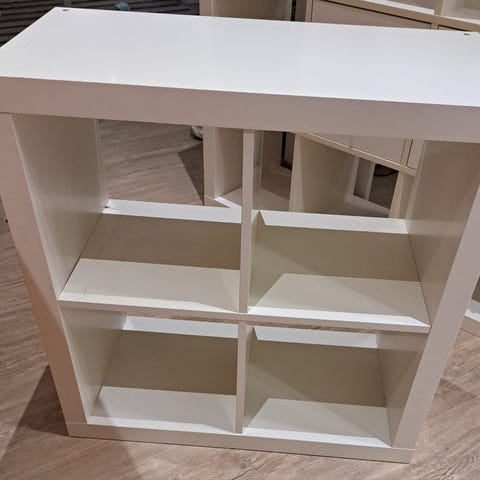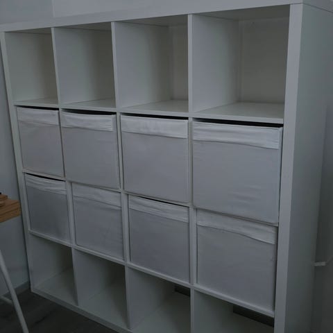Kohtuu kuntoinen hyllykkö, missä kahdet irroitettavat vihreät kaapinovet. Kaapissa pieniä elämisen jälkiä, mutta yleis ilme on hyvä.