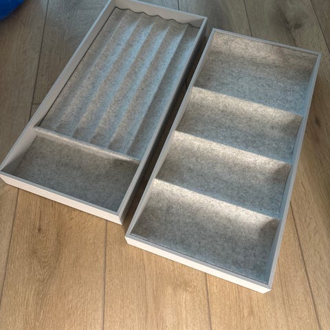 Myydään 2kpl Komplement hyllyn sisusteita lipastoon. Säilytyslokerikot koruille, kelloille, ruseteille tms.
