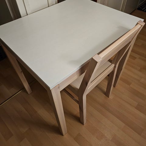 Ikean ruokapöytä, muutaman vuoden ollut käytössä. Muuten moitteeton, pöydässä muutama pieni tahra, joista ei valitettavasti kuvaa juuri nyt.