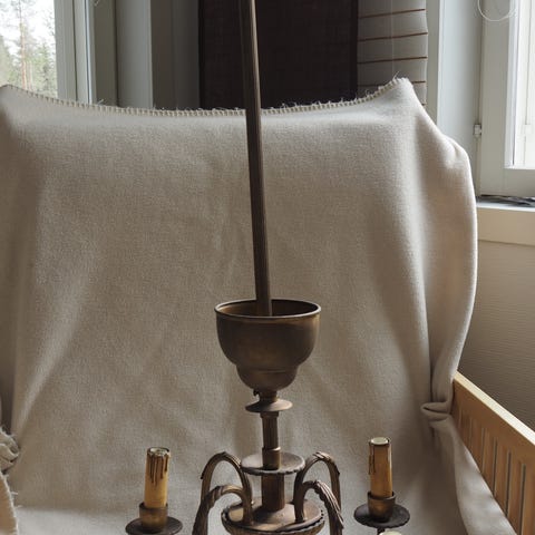 Messinkinen kattovalaisin kolmelle lampulle. Vaatii sähkötöitä. Voinee käyttää myös perinteisillä kynttilöillä. Paavo Tynell -henkiset koristekukat, leima puhuu kuitenkin jonkun muun suunnittelijan (/valmistajan) puolesta. Korkeus n. 70cm, leveys n. 40cm.