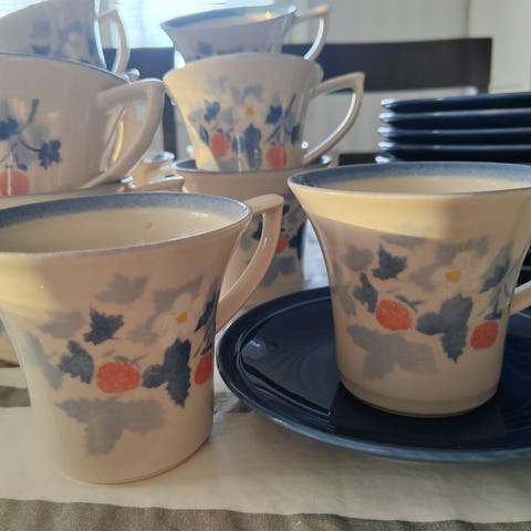 Pentikin Mansikka-sarjaa; Piirakkavuoka (30cm), ruokalautanen (24cm) 10kpl, kahvikuppi 14kpl, muki 4kpl, pieni lautanen (17cm) 12kpl, sokerikko+kermakko, kulho 2kpl (14cm/16cm), voiastia, kannu ja teekannu. Ensisijaista myydään kaikki kerralla.