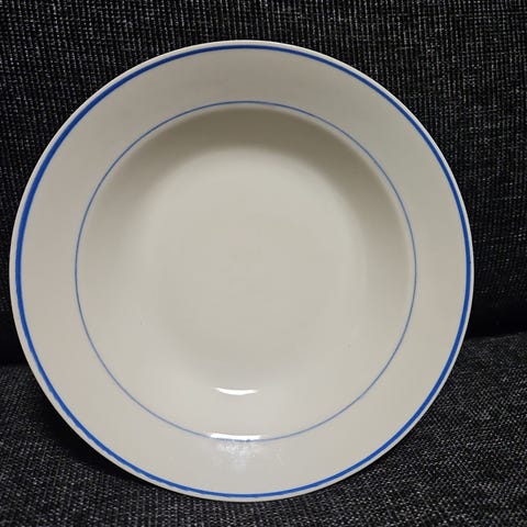 Myydään 2kpl Arabia Siniraita syviä lautasia. Lautasissa erilaiset leimat. Piippuleimaisessa lautasessa alareunassa pieni lohkeama, ei näy yläpuolella.