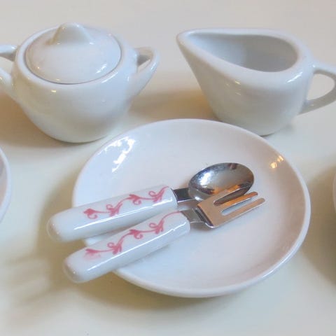 Nuken kahviastiasto, "posliinia". Neljä kahvikuppia asetteineen, kahvikannu ja kermakko. Kannun korkeus n.16cm, kuppien n. 4cm. Ei leimoja. Ehjiä.