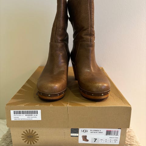 UGG talvikengät koko 38, vaalean sävyiset. Kengissä on lämmin vuori ja ne on suunniteltu kylmiin sääolosuhteisiin. Aika paljon käytetty Käytönjälkeä on niin ulko- kuin sisäpuolellakin näkyvissä, mutta edelleen lämpimät ja hyvät talvikengät. Kantapäissä sisäpuolella kulumaa, mutta ei teräviä kulmia yms, jotka hankaisivat.