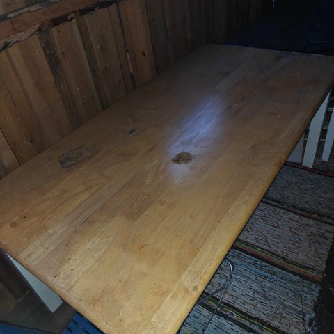 Annetaan täyspuinen ruokapöytä. Käytön jälkiä näkyvissä, mutta ehjä. Vain nouto. Jalat irrotettu tällä hetkellä.