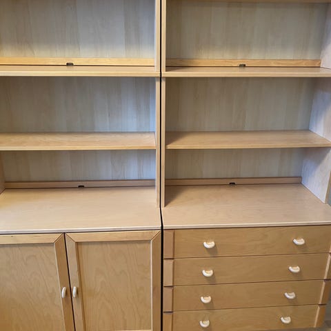 Kolmiosainen retrohenkinen kirjahylly.