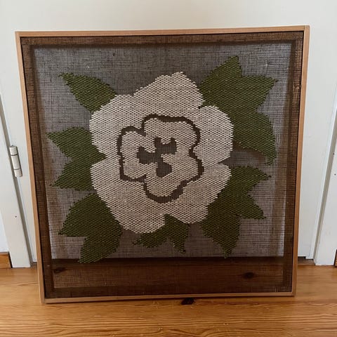 Koko noin 60 x 60 cm, mahdollista postitusta varten kehyksen voisi ottaa pois niin olisi kohtuuhintainen postitus. Viimeisessä kuvassa toinen minulla oleva kuvakudos, josta eri ilmoitus.