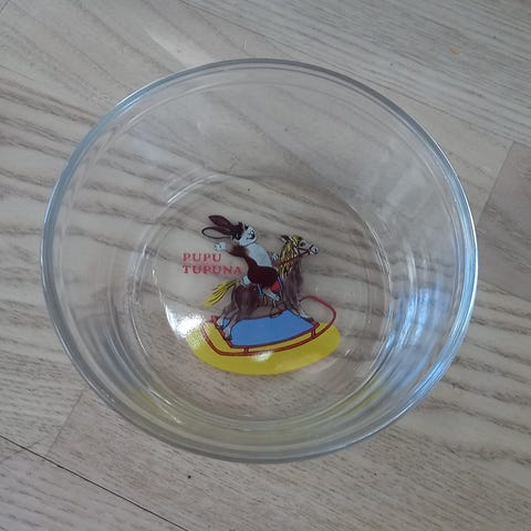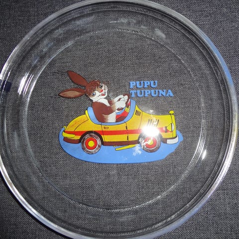 Retro Arabian lasinen Pupu Tupuna lautanen 80-luvulta. Muutama käytön jälki, mutta yleisilme mielestäni siisti ja painokuva hyvin säilynyt. Lautasen halkaisija n 20 cm. Mukana halutessa alkuperäinen laatikko, joka kulmasta rikkoutunut, mutta pohjasta voi leikata Pupu Tupuna naamarin.