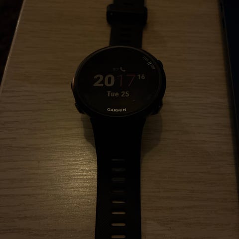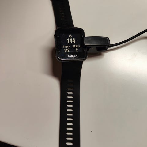 Garmin Forerunner urheilukello punaisella silikonirannekkeella ja latausjohto. Kello sisältää useita urheilutiloja ja mittausominaisuuksia, kuten sykkeen seurannan ja GPS-toiminnon. Sopii aktiiviseen käyttöön ja urheiluun. Näyttää myös saapuvat viestit ja puhelut näytöltä. Näytössä ei ole suurempia jälkiä mutta rannekkeen pieni viivakohokuvio on kulunut käytössä hieman. Täysin toimiva ja pitkä akunkesto edelleen.