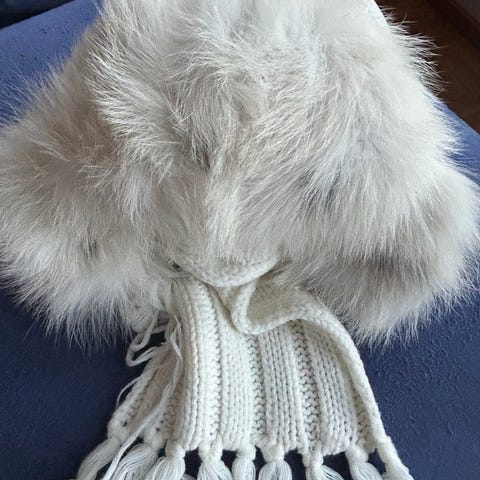 Kaksi unisex talvihattua (turkisosa kaninkarvaa) ja harmaa pitkä kaulaliina.