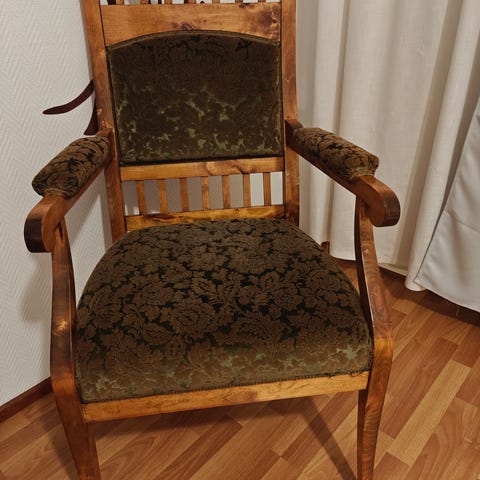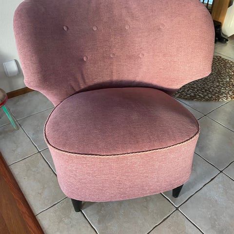 Kaunis kultaisella kohokuvio kankaalla oleva matala Bomanin kalustetehtaan valmistaja nojatuoli kaipaa pelastusta meidän kissojen kynsistä. Tuolissa on ajantuomaa patinaa parista kohtaa sauma hieman auennut. Mukava edelleen istua ja tuolissa mukavan leveä selkänoja. Istuma korkeus 36 cm. Menee suoraan käyttöön vaikka tällaisenaan tai oman halun mukaan verhoiltavaksi. Tuoli on juuri pesty tekstiilipesurilla.