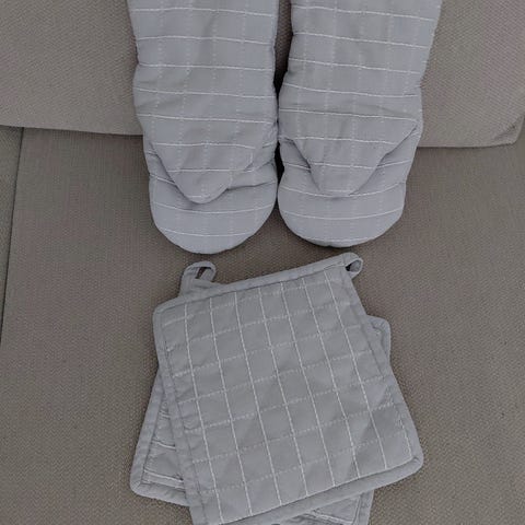 Paketissa olevat uudet keittiöliina ja hauska patakinnas (ysäriltä?).