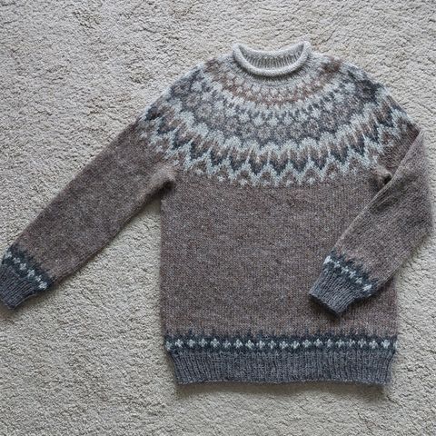 Neule lampaan villasta, selässä Bengtskärin majakan kuva. Koko noin L, kuvan mallille (170 cm) liian iso. Tarkempia mittoja saa tarvittaessa.