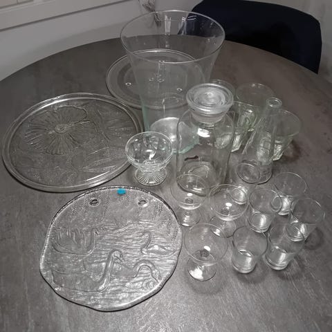 IKEA:n lasiastiat sisältävät kaksi kirkasta lasimaljakkoa ja kaksi lasista säilytyspurkkia, joissa on metallinen lukitusmekanismi. Mukana on myös kirkas, iso lasinen kulho ja musta neliön muotoinen alunen (esim. kynttilöille). Myyn kaikki kerralla! :)