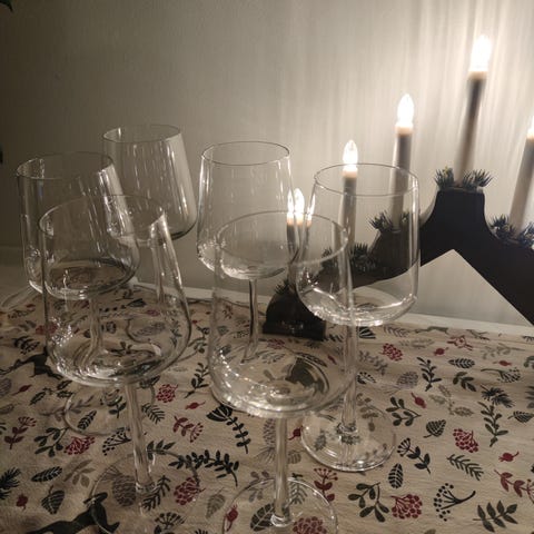 Kirkkaat punaviinilasit, uudet ja täysin käyttämättömät, Nouto.