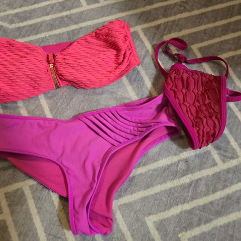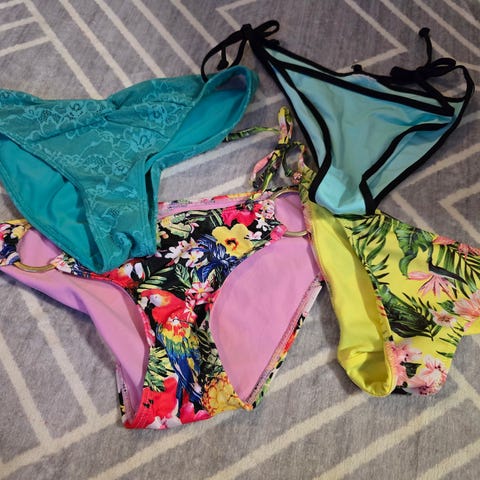 Yks uimapuku, 2kpl bikinin alaosia ja 1kpl bikinin yläosia. Kaikki ovat S-kokoa. Erittäin vähällä käytöllä olleet, joten ovat hyvässä kunnossa.
