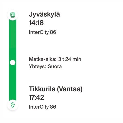 Junalippu Hämeenlinna - Tampere - Jyväskylä, su 11.1. 19:11 - 21:35, opiskelija
