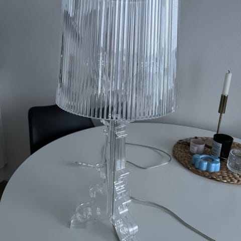 Pöytälamppu, lämmin amber-sävyinen valo.