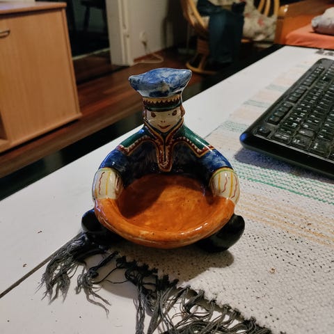 Kupittaan lappalaisukko aiheinen tuhkakuppi, täyttää myös pienoisveistoksen kriteerit, 1960-luvulta, hyväkuntoinen