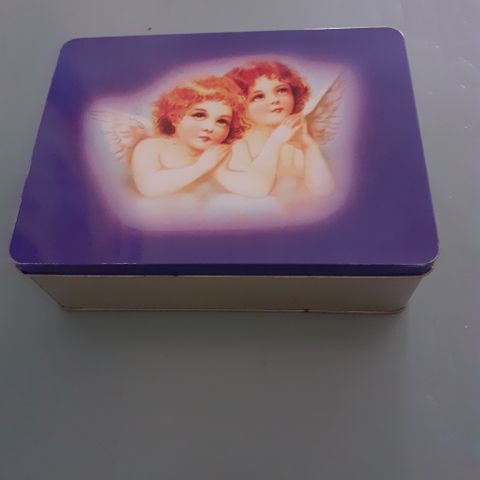 Pyöreä, reilunkokoinen peltirasia, enkeli -kuva-aihe