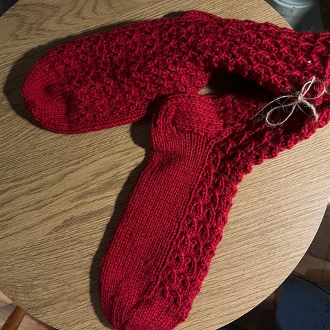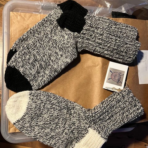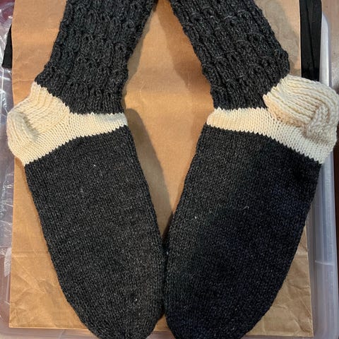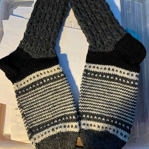 Käsintehdyt villasukat mustan ja beigen värisinä. Sukat ovat neulotut ja sopivat käytettäväksi viileissä olosuhteissa lämmittämään jalkoja.