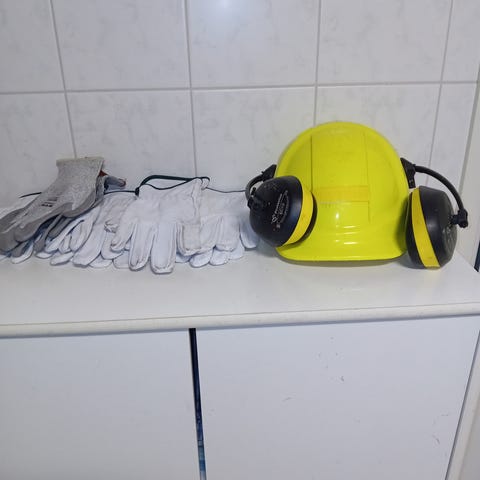 Varastoani penkoessa löysin turvakypärän (Portwest PS53 Suojakypärä Basic), jossa on kiinni kuulosuojaimet (Hellberg Secure 1, 25 dB) esim. rakennustöihin.