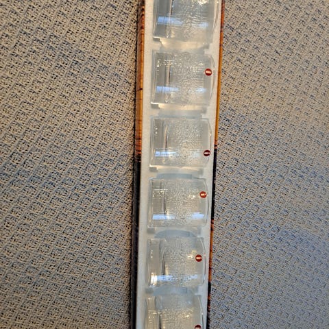 1970-luvun suomalaisen muotoilun kauneutta, ajattomat ja upeat lasit. Tuotannossa olivat 1990-luvulle saakka, nämä lasit lapsuudestani, joten vanhempaa tuotantoa. 4kpl on the rocks -laseja vetoisuus 20cl, 2 kpl whisky-laseja vetoisuus 18cl, 5kpl snapsilaseja vetoisuus 6cl. Lasien pinta rosoinen, jään pintaa muistuttava, lasit luovat kauniita varjoja ja heijastuksia. Hinta kaikista, mielellään myyn kaikki kerrallaan (jos haluat vain joitakin laseja, laita tarjousta 🙂). Kissatalous