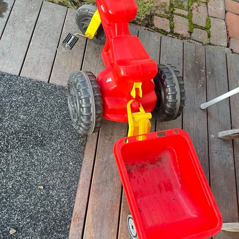 puinen traktori ja perävaunu. Leikkiauto, jossa on vihreä traktori ja puinen perävaunu. Soveltuu lasten leikkeihin.