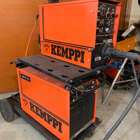 Kemppi mig hitsauskone. Koneella on hitsattu todella vähän. Pakettiin sisältyy kone paikalla oleva lankakela, sekä 4,5m pitkä polti.