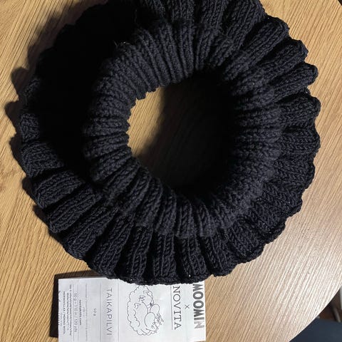 Neulottu kauluri, violetti väri, pyöreä muoto, lämmin materiaali. Sopii käytettäväksi viileissä olosuhteissa kaulan suojaamiseen.