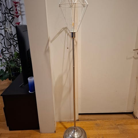 Myydään Ikean ÅRSTID lattiavalaisin, jalan väri nikkelöity. Varjostin vaihdettu alkuperäisestä valkoiseen kangaspintaiseen varjostimeen, jonka halkaisija 45 cm.
