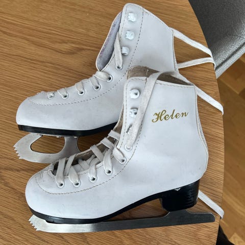 Myynnissä Helen-merkkiset taitoluistimet. Koko on merkitty 32, mutta suositeltavaa on vertailla ennen kaikkea pohjallisen pituuden mukaan, joka on noin 20,2 cm. Luistimia on käytetty hyvin vähän. Yleiskunto on siisti, ulkopinnassa voi olla pieniä käytön jälkiä, mutta ei mitään merkittävää. Sisäpuoli on siisti ja pehmusteet hyvässä kunnossa. Terät ovat kiinni ja luistimet ovat käyttökelpoisessa kunnossa.