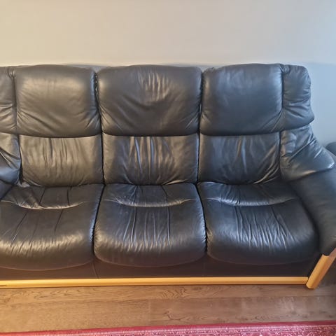 2hlö mekanismisohva, jossa keskellä mukitelineet ja laatikko esim. kaukosäätimien säilytykseen. Valkoista bonded-keinonahkaa, joka on aitoa nahkaa kestävämpää. Ikää sohvalla 3v ja toki siinä jonkin verran elämisen jälkiä näkyy. Sohvaa myy edelleen mustana Veke, löytyy hakusanalla ”Studio mekanismisohva” ja hinta 599€.
