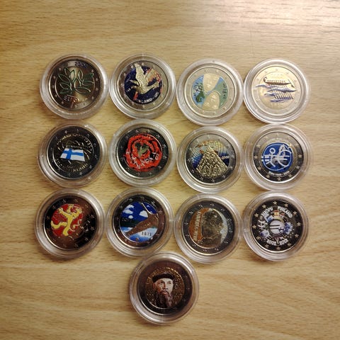 Kuvien uudenveroiset, kiertämättömät Suomen erikoiseurot vuosilta 2004-2025 yhteensä 39kpl. Setissä yksi kpl jokaista Suomen tähän mennessä julkaisemaa erikoiseuroa kiertämättömänä. Irtokolikot toimitetaan kuvista poiketen pyöreissä kolikkopillereissä (38kpl) + coincardissa oleva kolikko kortissaan. Hp: 195 euroa. Toimituskulut ostajalle valitsemansa toimittajan hinnaston mukaan. Myös nouto sopii.
