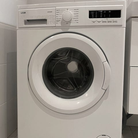 Logik L612WM23E edestä täytettävä pesukone. Pesukone on valkoinen ja varustettu useilla pesuohjelmilla, kuten pikapesu, villa, baby care ja puuvilla. Laite sisältää digitaalisen näytön ja pyörösäätimen ohjelmien valintaan.