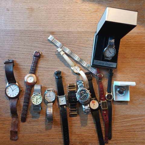 Molnija käy minuutti osoitin irti, Leopard ei käy, Certina käy, sen alapuolella oleva käy, MonReve käy, Timex ei käy ja Novus käy. Kaikki kerralla, nouto Lohjalta tai postit ostajalle.