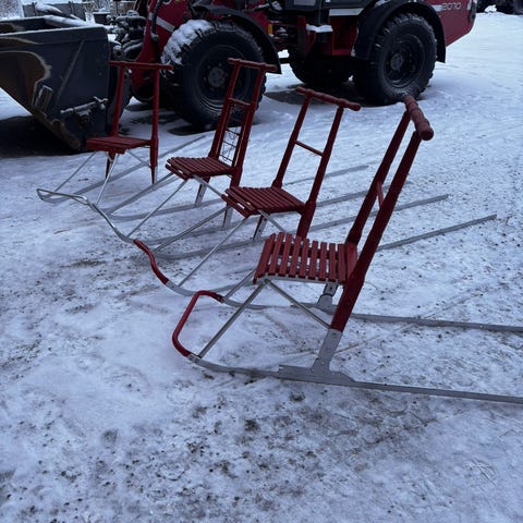 Esla aikuisten kelkka, punainen ja punainen lasten potkuri.Molemmat kelkat 100€.