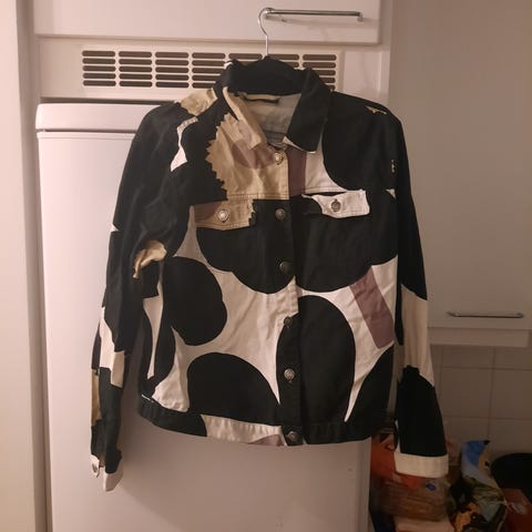 Marimekon unisex farkkutakki. Unikko placement, taskussa unikko.