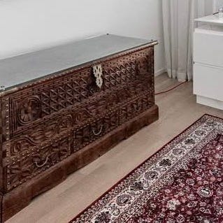 Vanha aasialaistyylinen kamferipuuarkku. Pieniä pintanaarmuja (ja likaa...) on mutta muuten täysin ehjä. Sisäpuoli moitteettomassa kunnossa.