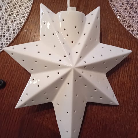 Iso joulutähti, 105 cm, valkoinen, valmistettu pahvista. Soveltuu sisäkäyttöön joulukoristeeksi. Tähti on varustettu rei'illä, jotka mahdollistavat valon läpäisyn. Halkaisija 105 cm. Kahden sakaran pohjassa pari korjausteippausta siksi hinta vain 9 euroa. Voin lähettää. Mmm.