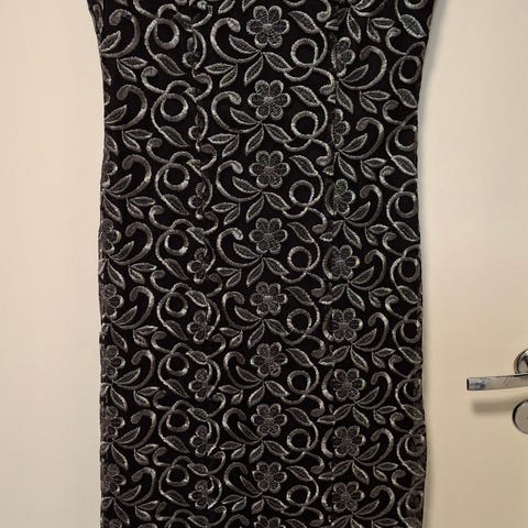 Upea Soulista ostettu juhlamekko, jossa pallohihat ja helma. Päällimmäinen kerros on musta hopeainen nyppymäinen kangas ja vuori on kevyempää sileää mustaa kangasta. Molemmat joustavat hyvin. Leikkaus on A-linjainen, kaula-aukosta jo kauniit laskokset ja armollinen kurveille :) Merkkiä en valitettavasti muista enää ja olen leikannut lapun niskasta pois.