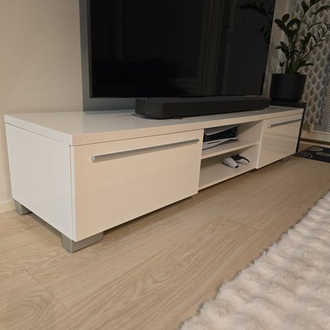 Kokovalkoinen 180cm pitkä tv-taso. Tasossa kaksi ovea reunoilla ja keskellä laatikko sekä avo-osa.