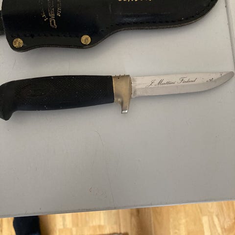 Käyttökelpoinen, terän kärki pyöristetty. Tuppi kunnossa, saa kiinnitettyä vyölle.