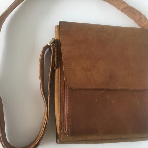 Nahkainen olkalaukku, väriltään ruskea, unisex-malli. Laukussa on säädettävä olkahihna ja vetoketjutasku takana. Sisätiloissa useita lokeroita ja vetoketjutasku, jotka helpottavat pienten esineiden järjestämistä. Sisään mahtuu vaikka iPad. Mitat 30 x 22 x 8 cm. Tukevaa nahkaa. Valmistettu Kreikassa. Hinta 29 euroa. Voin lähettää. Mmm.